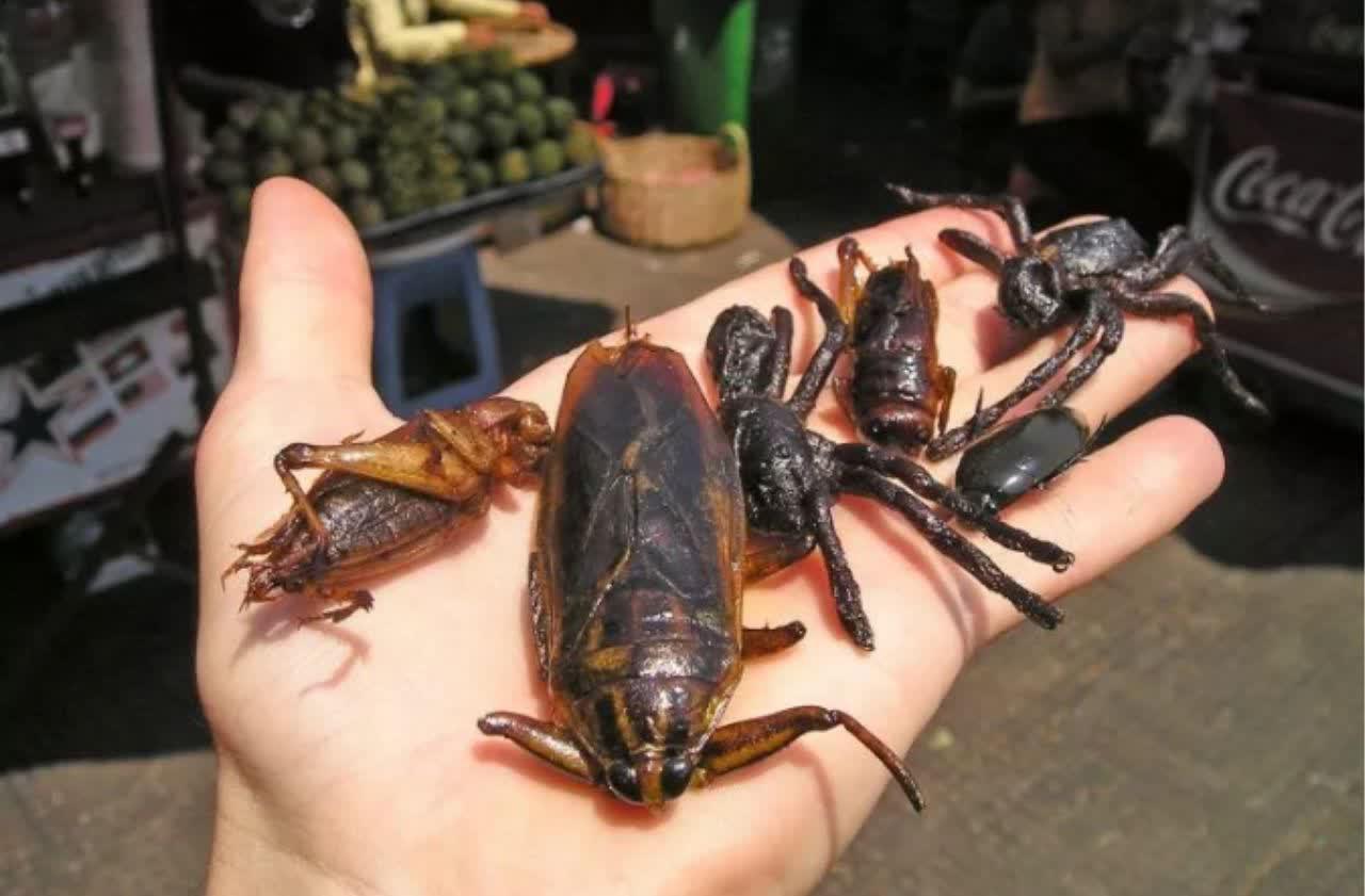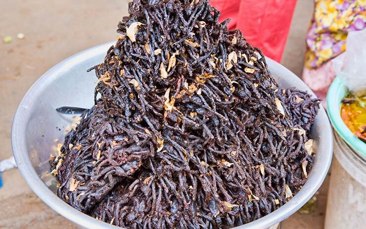 در خیابان های فرعی در سراسر کامبوج ، حشرات سرخ شده بسیار پرطرفدار است و به عنوان یک میان وعده عالی در نظر گرفته می شود. آنها در روغن سیر سرخ می شوند، از خارج ترد و از داخل گوشتی هستند. هرچند عمده این حشرات را رتیلها و عنکبوتها تشکیل میدهند اما سوسکها و ملخها نیز از دست آنان در امان نیستند.
