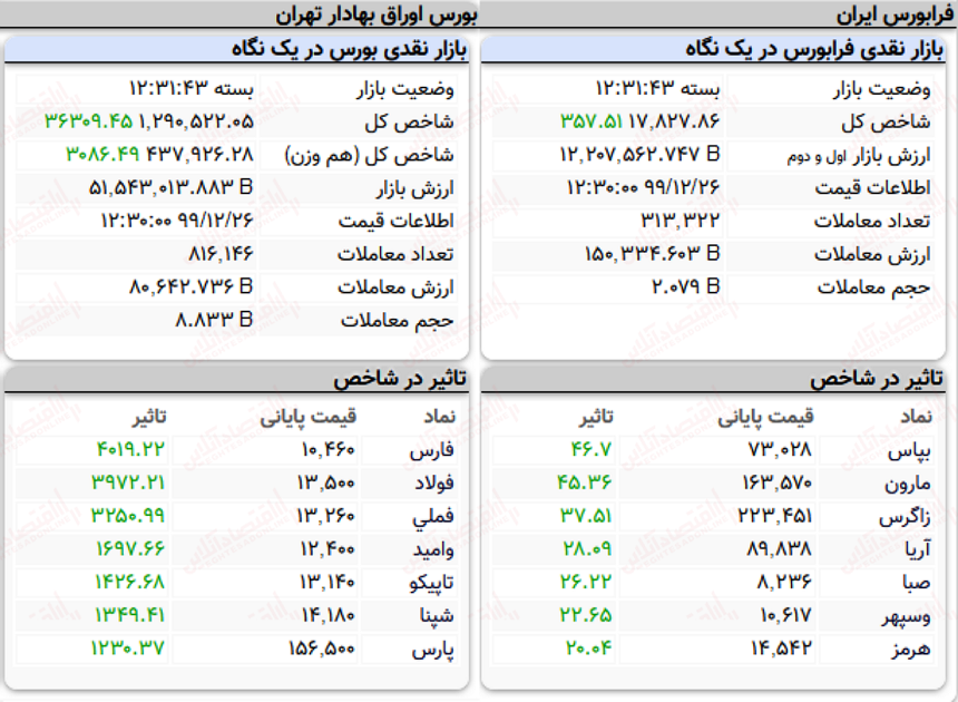 امروز نمادهای بیمه پاسارگاد (بپاس)، پتروشیمی مارون (مارون)، پتروشیمی زاگرس (زاگرس)، پلیمر آریای ساسول (آریا)، شرکت سرمایه گذاری صبا تامین (صبا)، سرمایه گذاری مالی سپهر صادرات (وسپهر) و فولاد هرمزگان جنوب (هرمز) تاثیر مثبت بر شاخص این بازار داشتند.