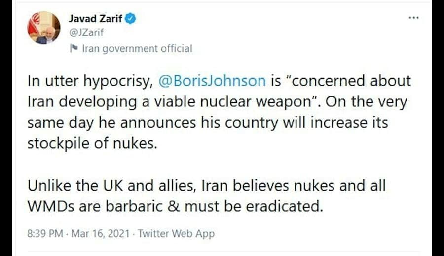 ظریف در این پیام توئیتری اظهار داشت: بوریس جانسون ریاکاری را به حد اعلی رسانده و درباره «توسعه سلاح هسته‌ای توسط ایران» ابراز نگرانی کرده است؛ درست در همان روزی که وی اعلام کرده که کشورش ذخایر سلاح‌های هسته‌ای خود را افزایش خواهد داد.»