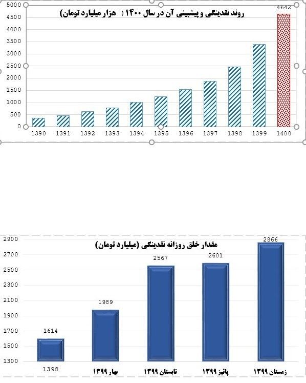 ارقام کل نقدینگی: بررسی آمارهای منتشره نشان میدهد که ماندۀ نقدینگی از رقم 2472 هزار میلیارد تومان در اسفندماه 1398، به بیش از 3210 هزار میلیارد تومان در دیماه 1399 رسیده است و برآوردها نشان میدهد که تا انتهای سال 1399 به حدود 3380 هزار میلیارد تومان میرسد، بهعبارت دیگر، نقدینگی در سال 1399 نسبت به سال 1398، رشدی معادل 37 درصد و افزایشی بیش از 900 هزار میلیارد تومان را تجربه کرده است و در صورتی که مدیریت فعلی در حوزۀ نقدینگی برقرار باشد، مقدار نقدینگی در انتهای سال 1400 به حدود 4600 هزار میلیارد تومان خواهد رسید.
