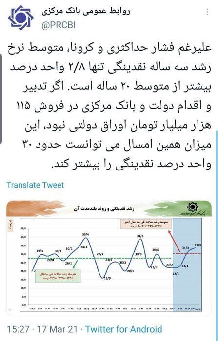 روابط عمومی بانک مرکزی در پیامی توییتری نوشت:با وجود فشار حداکثری و کرونا، متوسط نرخ رشد سه ساله نقدینگی تنها ۲/۸ واحد درصد بیشتر از متوسط ۲۰ ساله است.