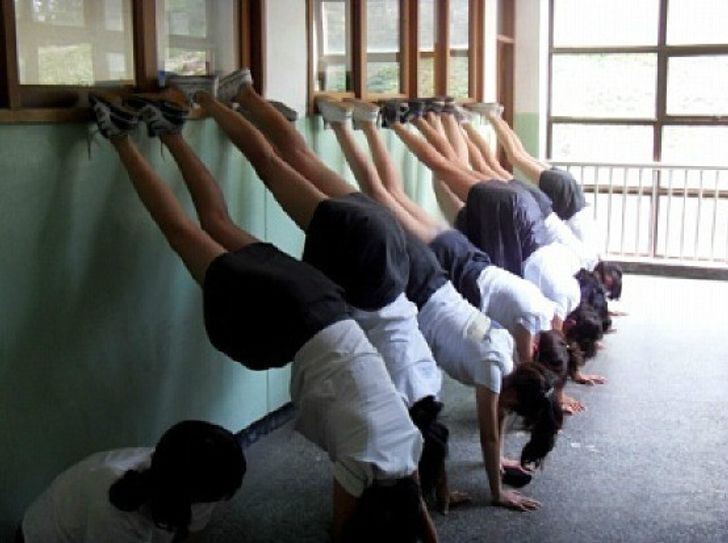 مدارس آسیا به سختگیر بودن نسبت به دانش آموزان و تنبیه های غیر معمول آن ها بسیار مشهور هستند. یکی از این روش های تنبیه، ایستادن روی دست به خاطر دیر آمدن و صحبت کردن در کلاس است. از دیگر روش های تنبیه می توان به شنا رفتن، دویدن یا بالا نگه داشتن دست ها به عنوان تنبیه اشاره کرد. سیلی زدن و روش های تهاجمی تر نیز دیده شده است.