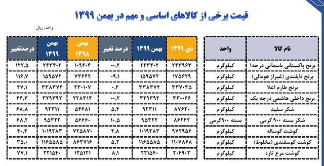 بررسی قیمت این اقلام اساسی طی یک ماه نیز نشان میدهد قیمت همه اقلام یاد شده به جز برنج پاکستانی با کاهش ۰.۲ درصدی، تایلندی با کاهش ۹.۱ درصدی و هاشمی با کاهش ۰.۲ درصدی در بهمن ۱۳۹۹ نسبت به ماه قبل از آن افزایش یافته و میزان افزایش قیمتها طی یک ماه هم بین ۰.۴ درصد (برنج طارم) تا ۱۰.۵ درصد (شکر بسته بندی) بوده است.