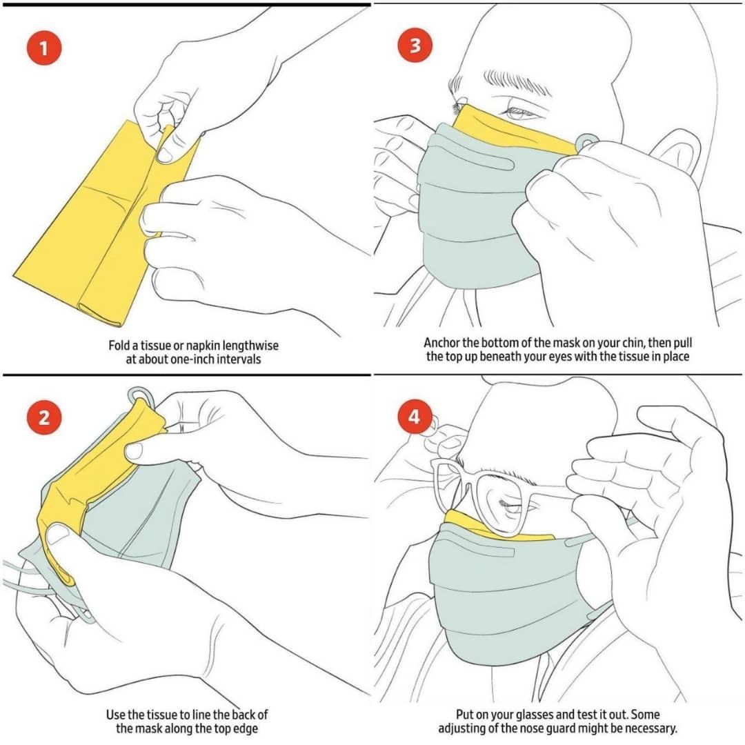 برای آن دسته از افراد جامعه که همزمان از عینک و ماسک استفاده می کنند و از مشکل بخار کردن عینک رنج می برند والاستریتژورنال پیشنهاد کرده است در زمان استفاده از ماسک و عینک به صورت همزمان یک عدد دستمال کاغذی را تا کرده و در لبه بالایی ماسک خود قرار بدهید، بدین گونه میزان بخار روی عینک کاهش می یابد.