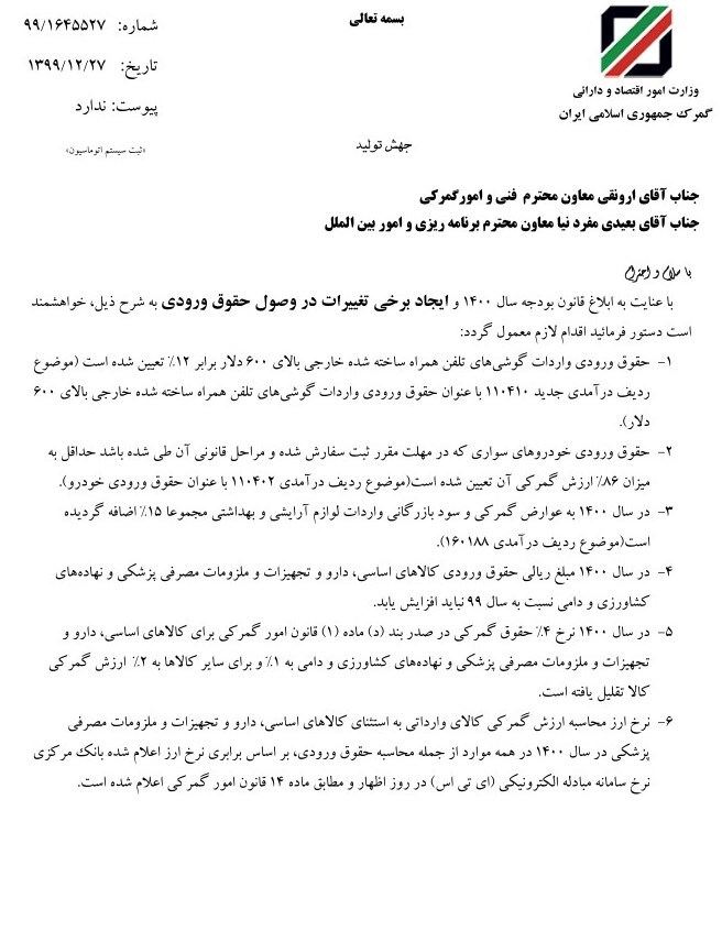 همچنین در دیگر تغییر اعمال شده نرخ ارز محاسبه ارزش گمرکی کالای وارداتی به استثنای کالاهای اساسی دارو و تجهیزات و ملزومات مصرفی پزشکی در سال 1400 در همه موارد از جمله محاسبه حقوق ورودی براساس نرخ ارز اعلام شده بانک مرکزی- نرخ سامانه مبادله الکترونیکی- در روز اظهار و مطابق ماده 14 قانون امور گمرکی اعلام شده است.