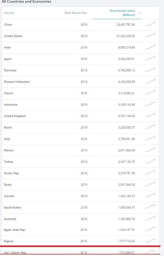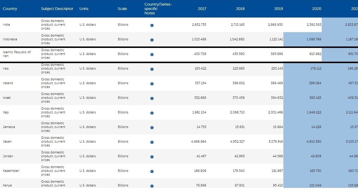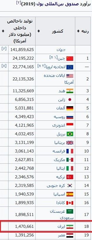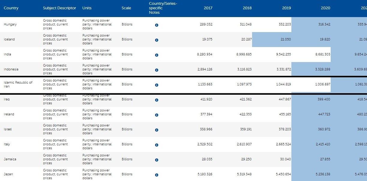البته جدول زیر که از یکی از گزارشهای صندوق بین المللی پول استخراج شده، نیز نشان می دهد، اقتصاد ایران طی سالهای 2017 تا 2020 بین 18 کشور برتر دنیا بوده است.
