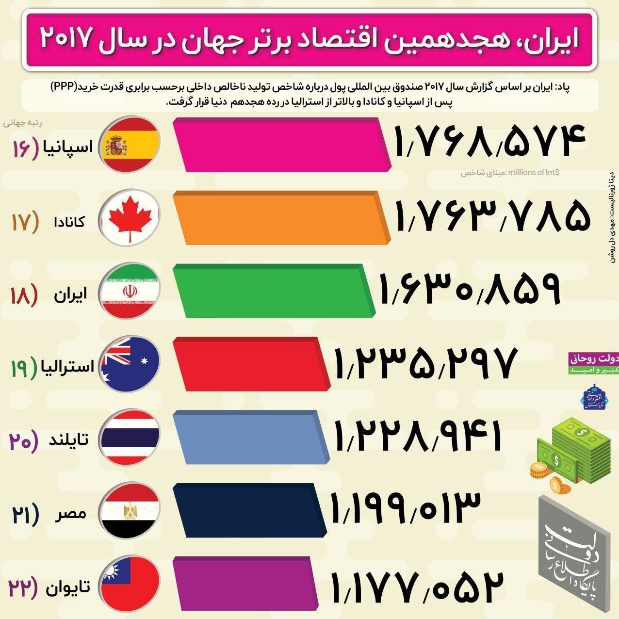 همانطور که در جدول بالا قابل مشاهده است، طبق براورد صندوق بین المللی پول، اقتصاد ایران بر اساس تولید ناخالص داخلی با معیار برابری قدرت خرید در سال 2019 در رتبه هجدهم دنیا بوده است. البته در سال 2017 میلادی نیز اقتصاد ایران رتبه 18 دنیا را داشت.