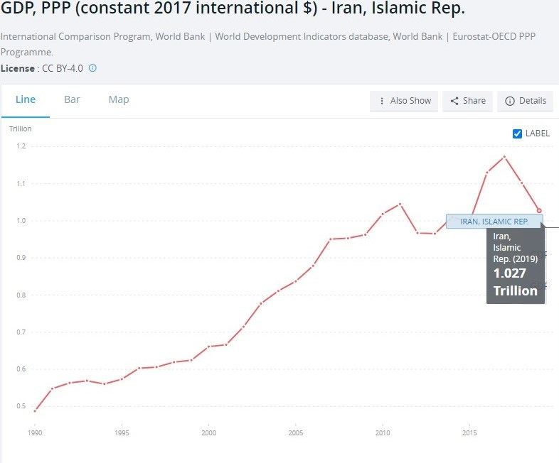 گفتنی است بر اساس آخرین گزارش بانک جهانی نیز تولید ناخالص داخلی کشور با معیار ppp یا برابری قدرت خرید حدود 1000 میلیارد دلار بوده است و ایران بین کشورهای دنیا در رتبه 21 قرار دارد. (برای مشاهده کلیک کنید)