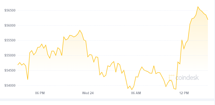 درحال حاضر بیت کوین با افزایش بیش از ۳ درصد به قیمت ۵۶ هزار و 517 دلار رسید.