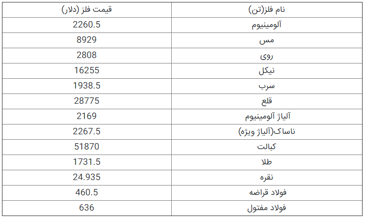 جدیدترین قیمت فلزات اساسی در بازار بورس فلزات لندن به این شرح است: