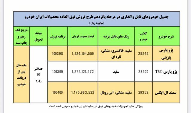 در پانزدهمین مرحله فروش فوقالعاده این گروه خودروسازی، سه محصول پژو پارس بنزینی، پژو پارس TU۵ و سمند LX با موعد تحویل حداکثر ۹۰ روزه عرضه شده است. پس از پایان مهلت ثبتنام، مراسم قرعهکشی برای تعیین مشتریان نهایی، روز ۱۵ فروردین ماه (یکشنبه هفته آینده) در سالن کنفرانس معاونت بازاریابی و فروش ایرانخودرو در حضور نمایندگان نهادهای ناظر برگزار خواهد شد.