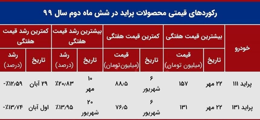 از سوی دیگر ارزیابی روند قیمت هفتگی خودرو در نیمه دوم سال ۹۹ نشان دهنده آن است که پراید ۱۱۱ نیز رکورد افت قیمت را در ۲۹ آبان با افت ۱۲٫۶ درصدی شکست و بیشترین افت قیمت را از آن خود کرد. بیشترین رشد قیمت این خودرو نیز در تاریخ ۱۰ مهر رخ داده که ۲۰٫۸۳ درصد بوده است