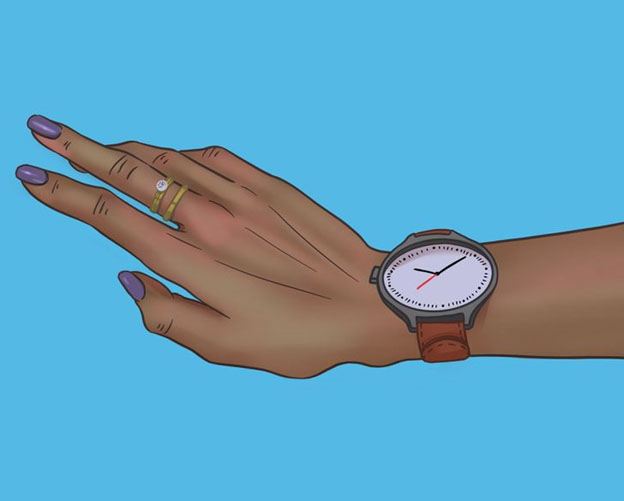 ممکن است خیلی ها فکر کنند انگشتر در انگشت اشتباه قرار دارد. اما این جواب نیست، زیرا این فقط یک حلقه طبیعی است. خطا در ساعت است. ساعت های مچی با پین تنظیم کننده ی خود، همیشه در سمت راست ساخته می شوند.