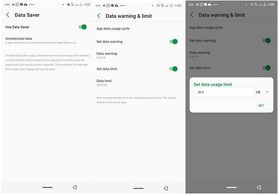 اگرچه روش بالا میتواند باعث قطع دسترسی برنامهها به اینترنت دیتا شود، اما شما باید یک هشدار برای میزان مصرف درنظر بگیرید و همچنین مصرف دیتا را هم محدود کنید. برای چنین کاری مراحل زیر را انجام دهید: