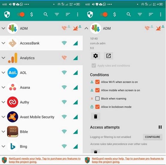 NetGuard یک برنامه فایروال است که نه تنها از مصرف داده موبایل توسط اپها جلوگیری میکند، بلکه میتوانید مانع از دسترسی آنها به اینترنت وای فای هم شوید. در حالت کلی از طریق این برنامه میتوانید مشخص کنید که کدام برنامه به اینترنت وصل شود و کدام یک به آن دسترسی نداشته باشد.