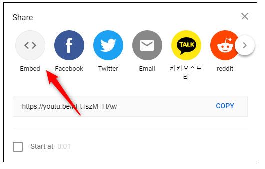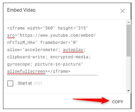 پنجره Embed Video ظاهر می شود. برای کپی کد در کلیپ بورد خود روی Copy کلیک کنید. در صورت تمایل، اگر می خواهید فیلم را از زمان مشخصی شروع کنید، کادر کنار Start At را علامت بزنید و زمان مورد نظر را وارد کنید.