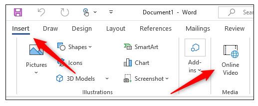 Word را باز کنید و از نوار ابزار بالا، روی برگه Insert کلیک کنید، سپس Online Video را در گروه Media انتخاب کنید.