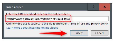 کادر Insert a Video ظاهر می شود. (Ctrl+V or right-click > Paste) URL یا را جایگذاری کنید، سپس روی Insert کلیک کنید.