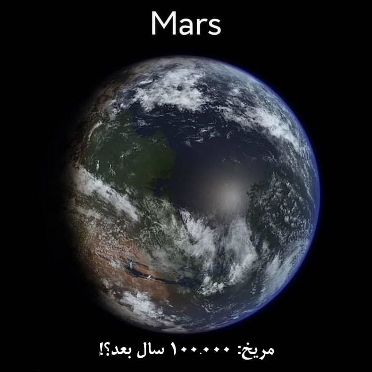 این تصویر، یکی از مدلهایی است که برای آینده مریخ تصور میشود (حدودا ۱۰۰.۰۰۰ سال بعد!) البته ایجاد آب و هوایی مثل زمین بر روی مریخ، بیشتر به یک رویاءپردازی و خیال شبیه است؛ و شاید بد نباشد همانقدر که به فکر ایجاد شرایط مشابه کره زمین در سیارات دیگر هستیم، به مراقبت و محافظت از خود کره زمین هم فکر کنیم!