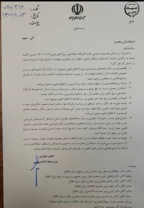 وزیر جهاد کشاورزی نگهداری و ذخیرهسازی مرغ در سردخانههای استانها، فروش قطعهبندی مرغ تنظیم بازاری با نرخهای آزاد و فروش مرغ سبز و بدون آنتی بیوتیک با قیمتهای غیر مصوب را تا اطلاع ثانوی ممنوع اعلام کرد.