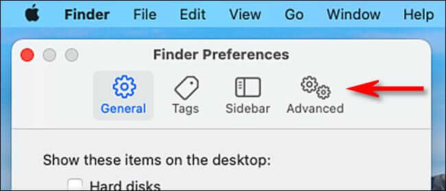پس از باز شدن پنجره “Finder Preferences”، باید “Advanced” را برگزینید.