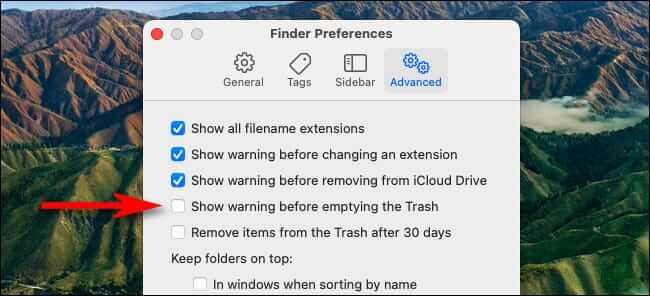 در بخش “Advanced” باید تیک کنار گزینه “Show warning before emptying the Trash” را بردارید.