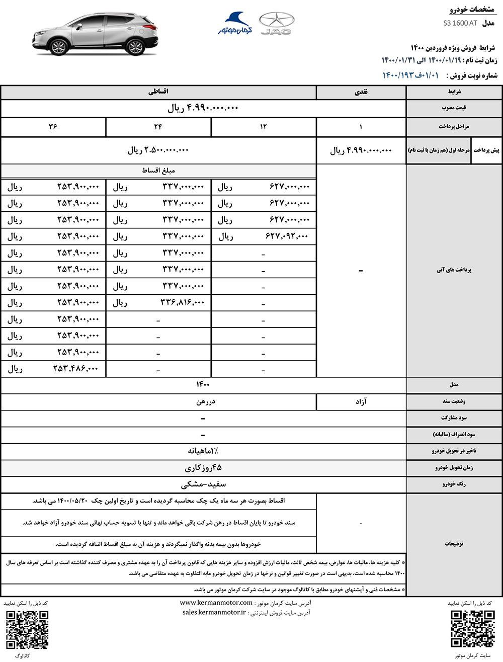 شرکت کرمان موتور فروش نقدی و اقساطی خودرو جک اس 3 را از 19 فروردین آغاز کرد.