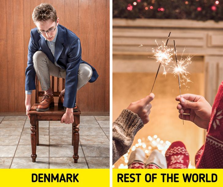 تقریباً هر کشوری سنتهای مخصوص به خود را برای جشن گرفتن شب سال نوی میلادی دارد. در دانمارک هم همینگونه است. پیش از آنکه ساعت به ۱۲ نیمه شب برسد، دانمارکیها روی صندلی میروند و آماده میشوند تا به محض آغاز سال جدید از رویش بپرند. اگر کسی فراموش کند که از در لحظهی شروع سال بپرد، این را بد یمن میدانند.