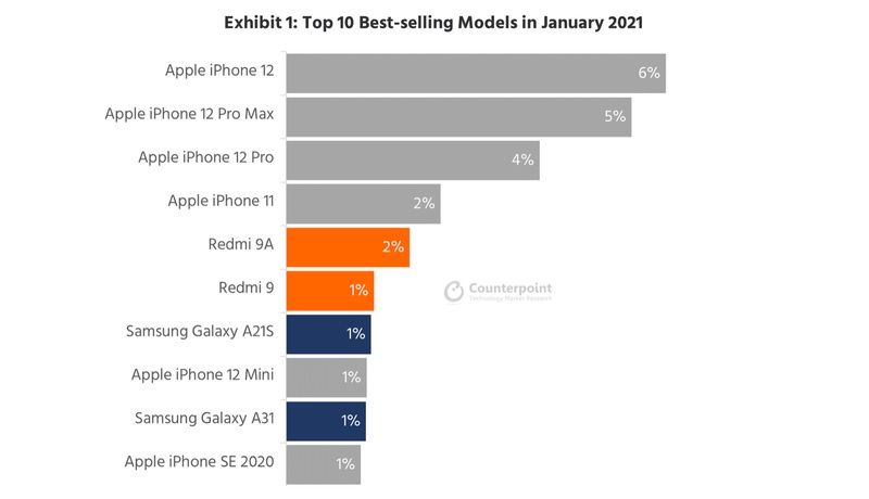 در لیست پرفروشترینهای ژانویه ۲۰۲۱ مدل ۲۰۲۰ گوشی آیفون SE هم به چشم میخورد که در رتبه دهم خودنمایی میکند. بنابراین ۶ گوشی حاضر در این فهرست محصولات اپل هستند و سایر آنها توسط شیائومی و سامسونگ تولید شدهاند.