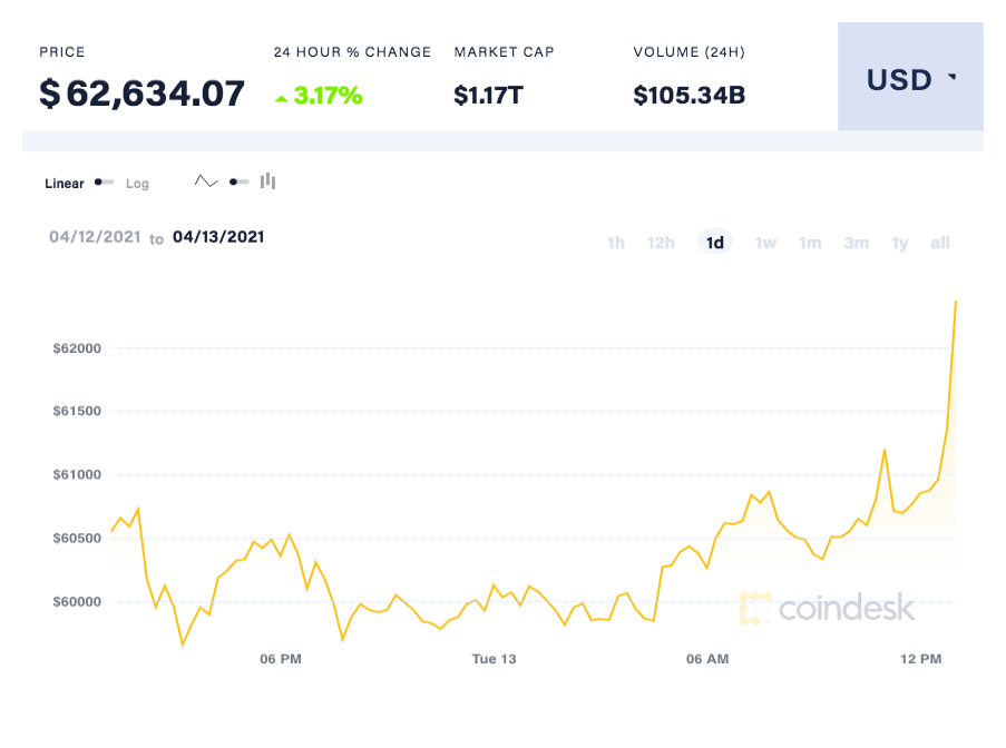 بیت کوین در حال حاضر از قیمت ۶۲ هزار عبور کرده و به قیمت ۶۲ هزار و ۶۳۴ دلار رسید.