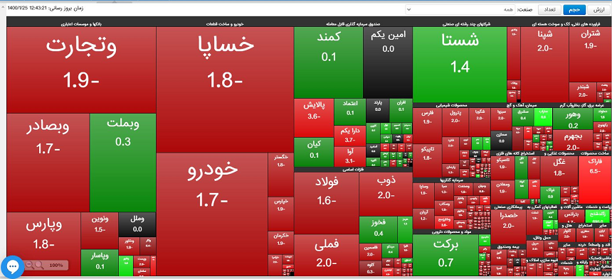 نمادهای پر تراکنش در بورس شامل شستا، دارویی برکت، فولاد مبارکه، ملی مس ایران، پالایش نفت اصفهان، ایرانخودرو و سایپا بودهاند.