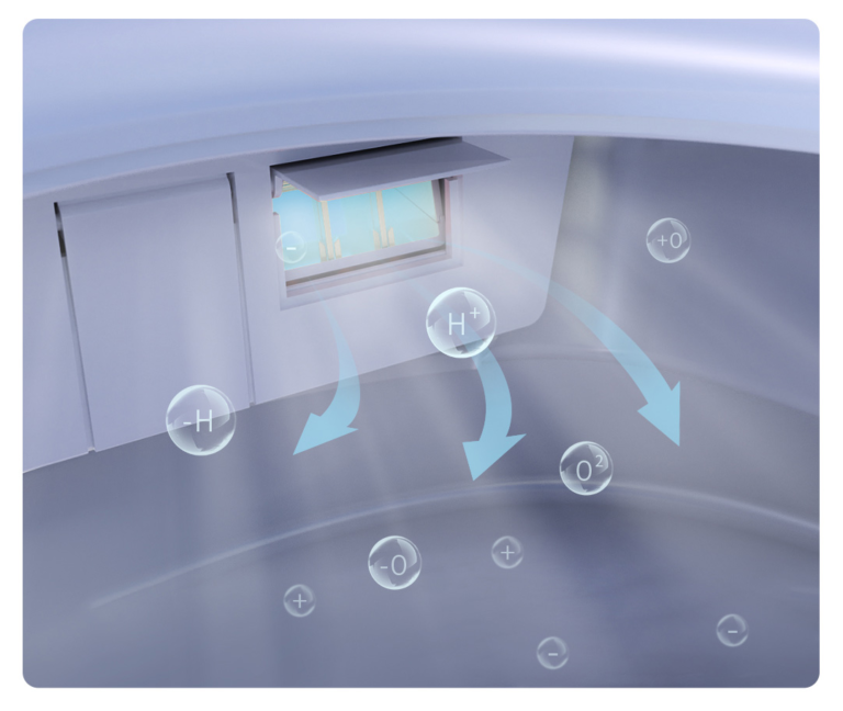 پس از روشن شدن، یونهای ضد عفونی کننده با هدف پاکسازی داخل توالت طی دو ساعت به صورت مداوم آزاد می شوند تا باکتری های درون توالت را از بین ببرند.