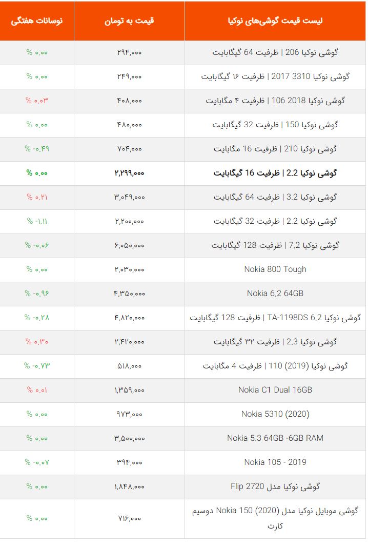 لیست قیمت انواع گوشیهای نوکیا 28 فروردین ۱۴۰۰