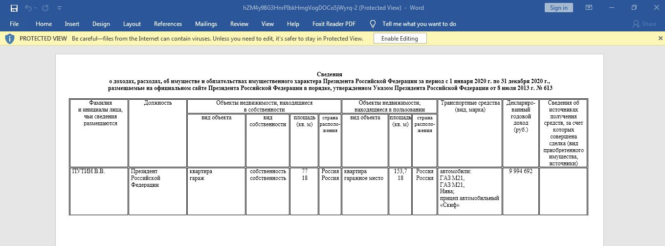 اظهارنامه درآمد، هزینه ها و دارایی رئیس جمهور روسیه در وب سایت کاخ کرملین قرار گرفته است.