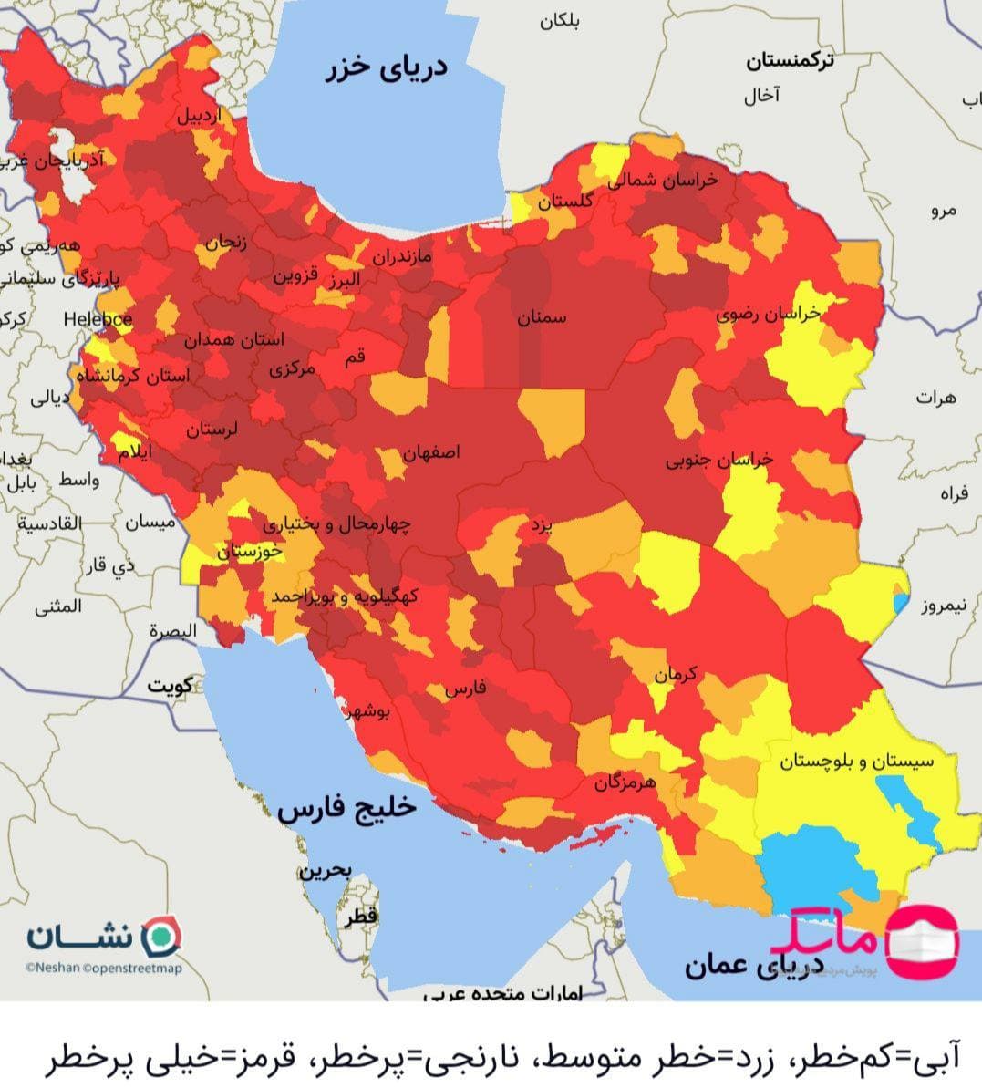 ۳۰۱ شهرستان در وضعیت قرمز، ۹۵ شهرستان در وضعیت نارنجی، ۴۵ شهرستان در وضعیت زرد و ۷ شهرستان در وضعیت آبی قرار دارند.