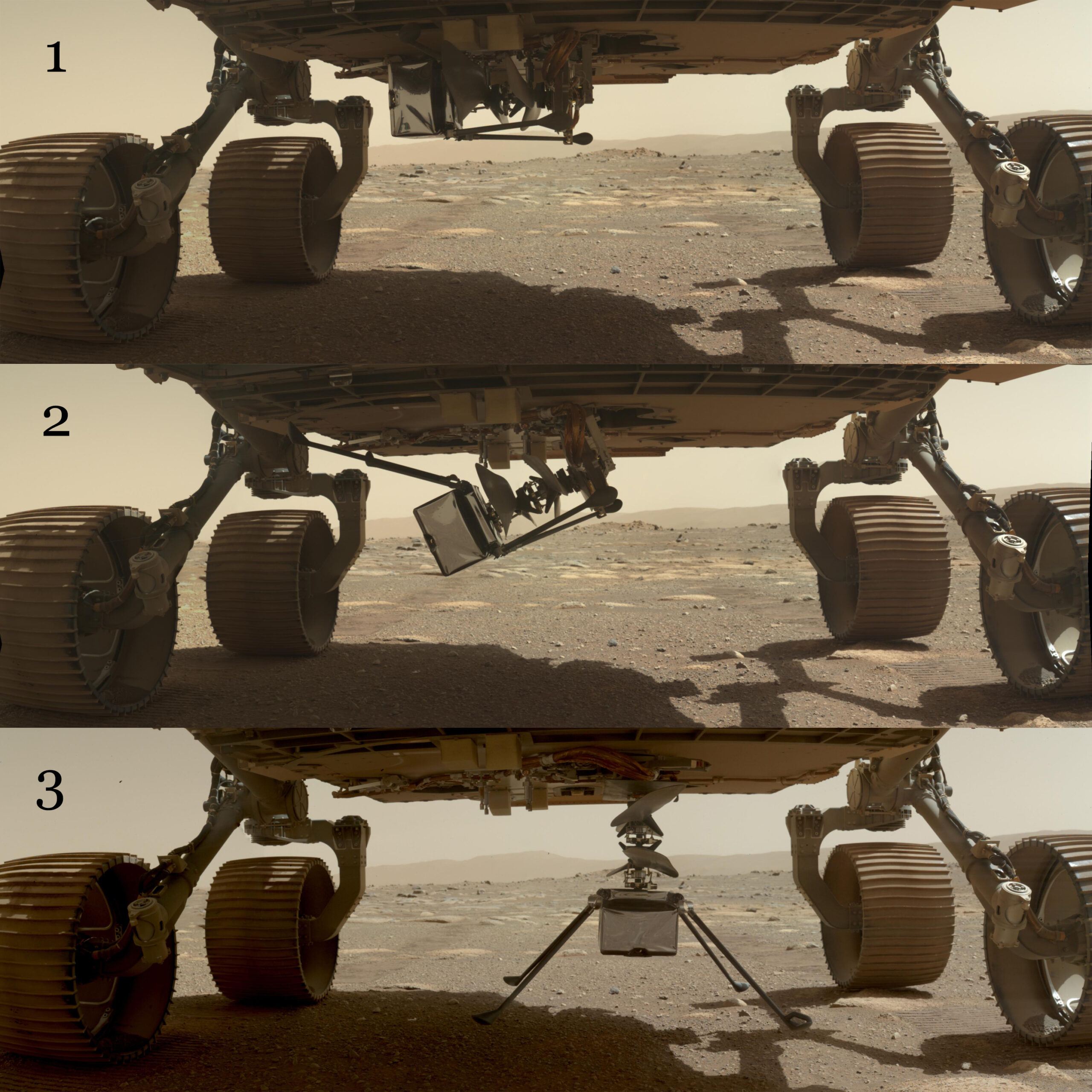سُل (Sol-روز مریخی) ۱: باز کردن قفل اتصال هلیکوپتر به مریخنورد.