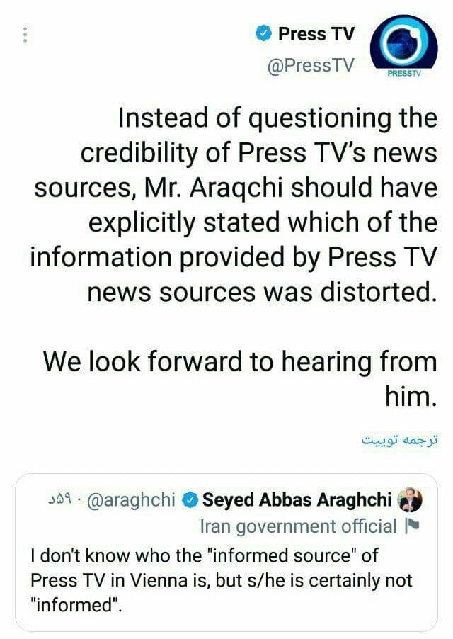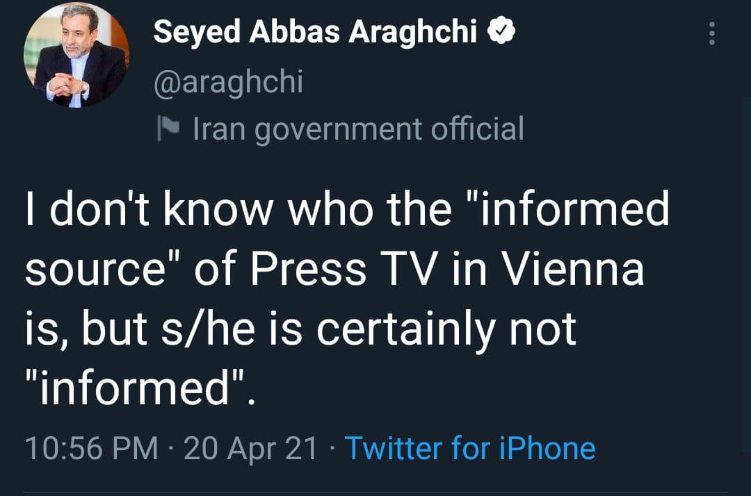 دقایقی قبل عراقچی در توییتی اعلام کرده بود نمیدانم منبع مطلع پرس تی وی در وین کیست، اما هر که هست اصلا مطلع نیست.