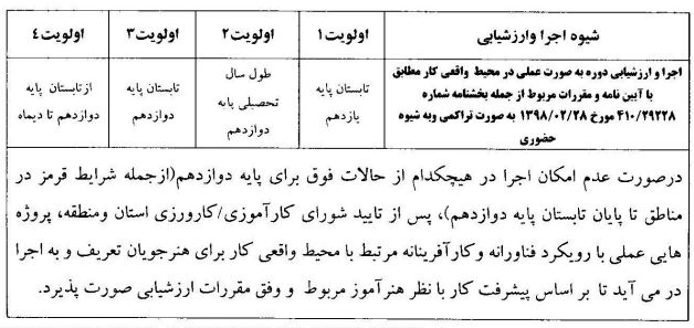 10. درس کارآموزی، کارورزی شاخه‌های فنی و حرفه‌ای و کاردانش متناسب با مصوبات ابلاغی از سوی مراجع ذیصلاح و شرایط فعالیت مشاغل گروه 1، 2، 3 و 4 (در وضعیت‌های سفید، آبی، زرد، نارنجی و قرمز) با رعایت کامل شیوه نامه‌های بهداشتی و نظارت شورای کارآموزی شهرستان، ناحیه، منطقه تا اعلام قطعی وضعیت عادی در تمام مناطق در یکی از اولویت‌های زیر اجرا و ارزشیابی شود: