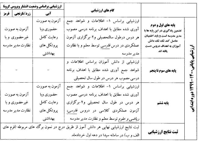 1. در شرایطی که امکان حضور فیزیکی دانش آموزان برای ارزشیابی پیشرفت تحصیلی تربیتی فراهم باشد ارزشیابی دانش آموزان مطابق آیین نامه‌های مربوطه و با مجوز ستاد کرونا و رعایت شیوه نامه‌های بهداشتی انجام خواهد شد.