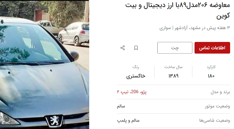 به گزارش سایت طلا ، بعد از معاوضه ویلاهای لاکچری با بیتکوین حالا نوبت به معاوضه خودرو با بیت کوین رسیده است. نمونه آن آگهی معاوضه ۲۰۶ با بیت کوین در شهر مشهد است.
