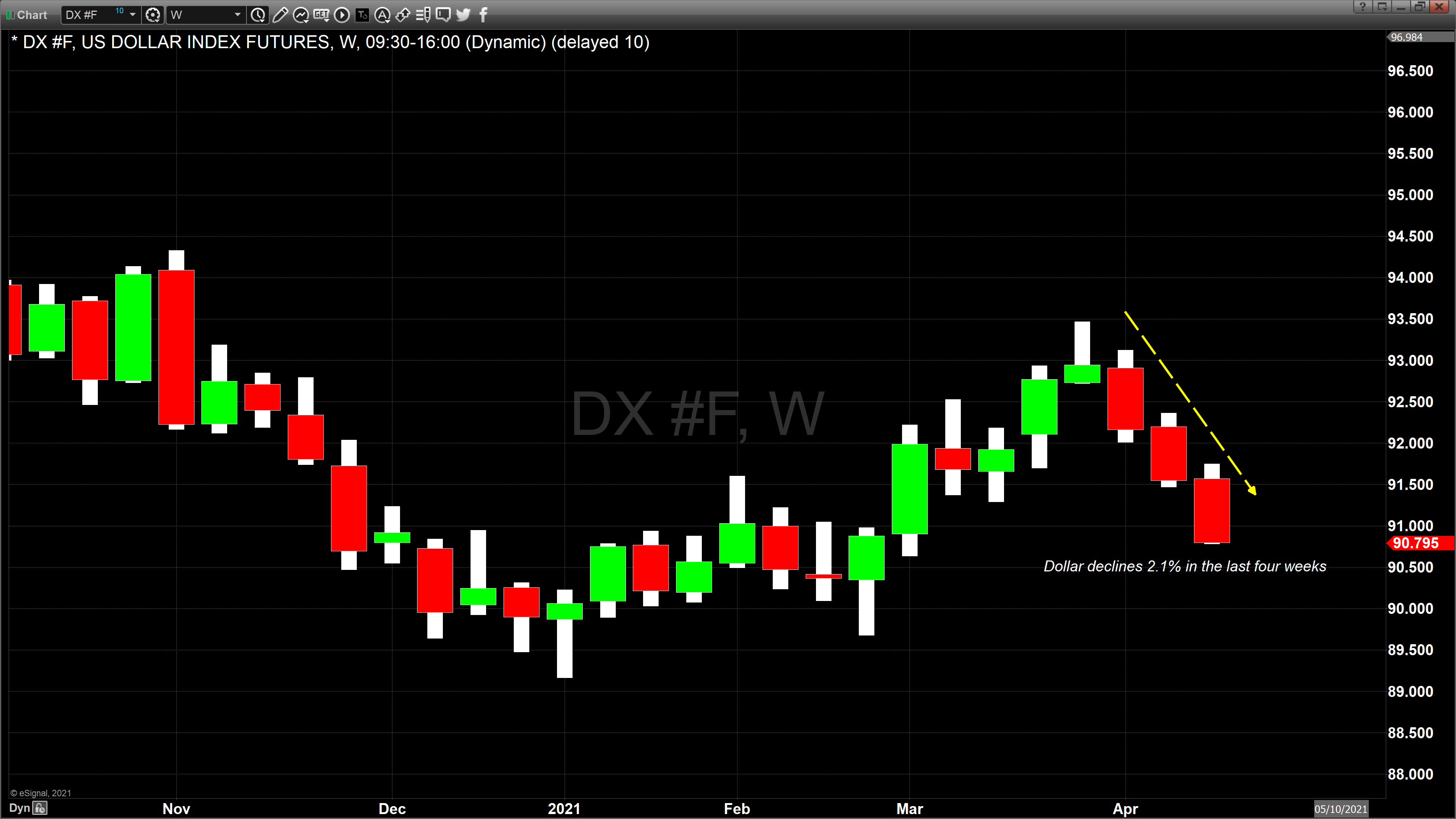 طی چند هفته اخیر شاخص دلار آمریکا بیش از 2 درصد از ارزش خود را از دست داده است که مهم ترین عامل افزایشی قیمت طلا تا نزدیکی سطح 1800 دلار بوده است.