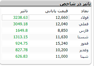 فولاد مبارکه اصفهان، ملی صنایع مس ایران، صنایع پتروشیمی خلیج فارس، سرمایه گذاری تامین اجتماعی، فولاد خوزستان، سرمایه گذاری غدیر و پالایش نفت اصفهان، نسبت به سایر نمادها بیشترین تاثیر مثبت را روی بورس گذاشتند.