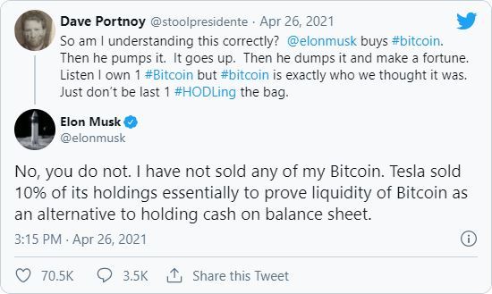 ماسک در واکنش به اتهامات یک شخصیت مطرح اینترنتی به نام «دیو پورتنوی» چنین حرفی را توییت کرده. پورتنوی در توییتی مدیرعامل تسلا را به سوءاستفاده از بازار بیت کوین متهم کرده بود و ماسک در پاسخ گفته که هیچ کدام از بیت کوینهای خودش را نفروخته است.
