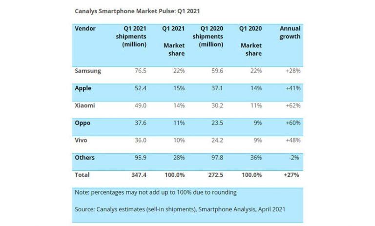 در سهماههی نخست ۲۰۲۱ سامسونگ با داشتن سهم بازار ۲۲ درصدی بار دیگر مقام اول را به دست آورده و طی این مدت ۷۶.۵ میلیون گوشی به دست کاربران رسانده است. اوپو و ویوو هم به ترتیب با داشتن سهم بازار ۱۱ و ۱۰ درصدی در مقام چهارم و پنجم بازار جهانی موبایل قرار گرفتهاند.