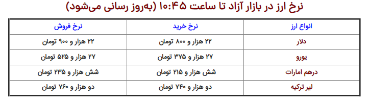 دلار و یورو در صرافی‌ها هم به ترتیب ۲۲ هزار و ۸۰۰ تومان و ٢۷ هزار و ۳۷۵ تومان خریداری شدند. همچنین درهم امارات شش هزار و ۲۳۵ تومان و لیر ترکیه دو هزار و ۷۶۰ تومان فروخته شدند.