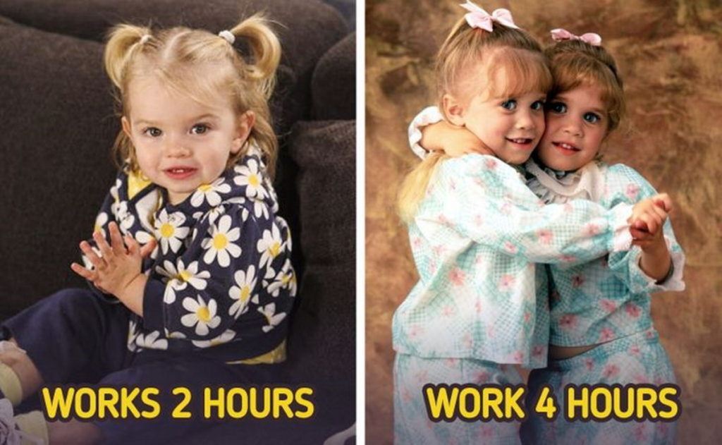 در کالیفرنیا کودکانی که زیر ۶ ماه سن دارند موظفاند تا ۲ ساعت در روز را در کنار مجموعه باشند و ۲۰ دقیقه کار کنند. کودکان از ۶ ماه تا ۲ سال نیز میتوانند ۴ ساعت در کنار مجموعه بوده و ۲ ساعت در روز را کار کنند. به همین دلیل است که کارگردانان آمریکایی سعی میکنند از دو قلوها برای انجام کار خود استفاده کنند چرا که این کار هم به بالا بردن تعداد ساعات کمک کرده و هم اگر یک کودک حال و روز چندان مناسبی نداشت، از دیگری بتوان استفاده کرد.