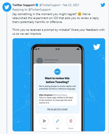در این ویژگی جدید، اگر پلتفرم متن پیام را توهین آمیز تشخیص دهد از کاربران پرسیده می‌شود آیا می‌خواهند توئیت خود را مرور کنند یا خیر؟!؛ چرا که این شامل توهین، فحاشی و اظهارات نفرت انگیز است. در مورد ساخت این ویژگی توئیتر می‌گوید: "این یک توئیت کاملا معمولی بوده که به صورت آزمایشی است و احتمال دارد که نیاز به بازبینی داشته باشد." و اکنون این درخواست‌ها را در iOS و به زودی در Android ارائه می‌دهیم.