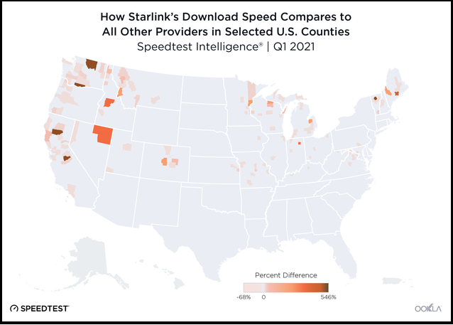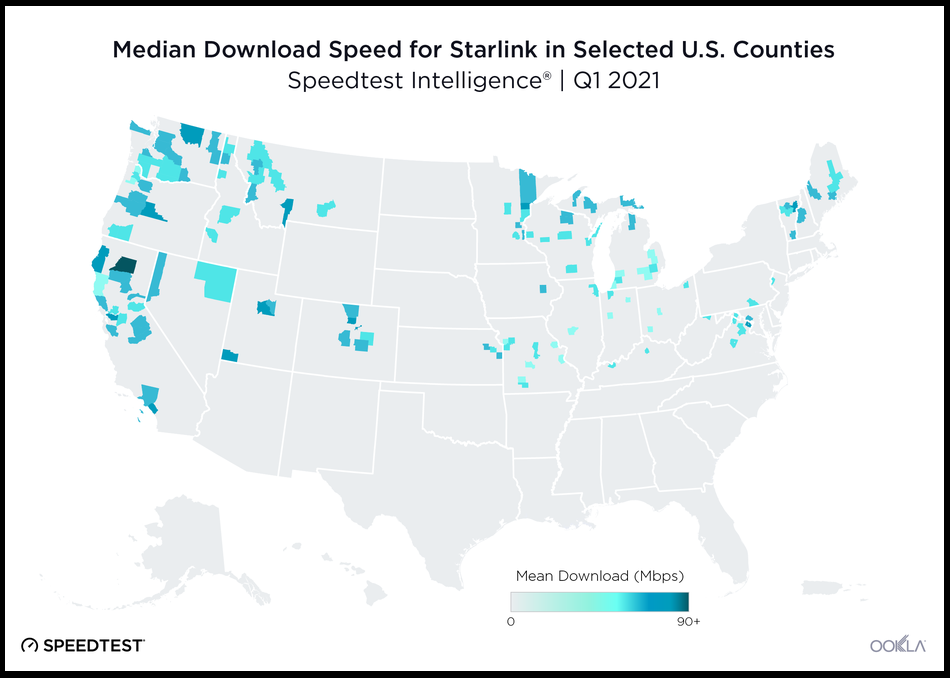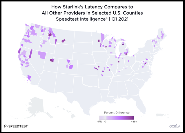 متوسط سرعت دانلود محتوا در آمریکا از ۴۰.۳۶ تا ۹۳.۰۹ مگابایت بر ثانیه متغیر است. اوکلا گفته است: "این موضوع نشان دهنده این است که استارلینک بهبود چشمگیری به نسبت دیگر ارائه دهندگان پهن باند ثابت داشته و اصلا جای ناامیدی نیست. " همچنین اوکلا اعلام کرده است: " تاخیر شبکه در استارلینک از ۳۱ میلی ثانیه در کیتیتاس واشینگتن تا ۸۸ میلی ثانیه در اتسگوی میشیگان دیده شده است. " یعنی این تاخیر ۴۸۶ برابر پهن باند قدیمی در مناطق مذکور است.