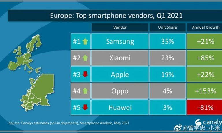 بر اساس این گزارش که از طرف شرکت مشهور Canalys منتشر شده، شیائومی با عبور از اپل موفق به تصاحب مقام دوم بازار موبایل اروپا شده است. به طور مشخص، سهم بازار شیائومی در این منطقه به ۲۳ درصد رسیده و اپل با داشتن سهم بازار ۱۹ درصدی به مقام سوم سقوط کرده است. بر اساس بررسی‌های صورت گرفته، شیائومی نسبت به سال گذشته در این بازار با رشد ۸۵ درصدی مواجه شده ولی رشد اپل فقط ۲۲ درصد بوده است.