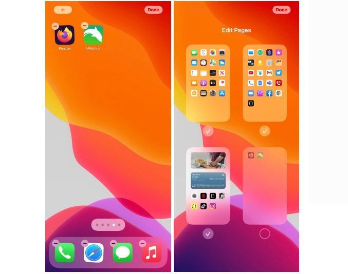 در اینجا میتوانید نسخه کوچکی از تمامیصفحات خود (به استثنای اپ لایبرری و تودی ویو) را مشاهده کنید. پایین هر کدام از صفحات، یک علامت وجود دارد و برای مخفی کردن هر صفحه، باید آن علامت را بردارید. در آخر روی گزینه Done که در قسمت بالایی و سمت راست صفحه جای گرفته، تپ کنید.